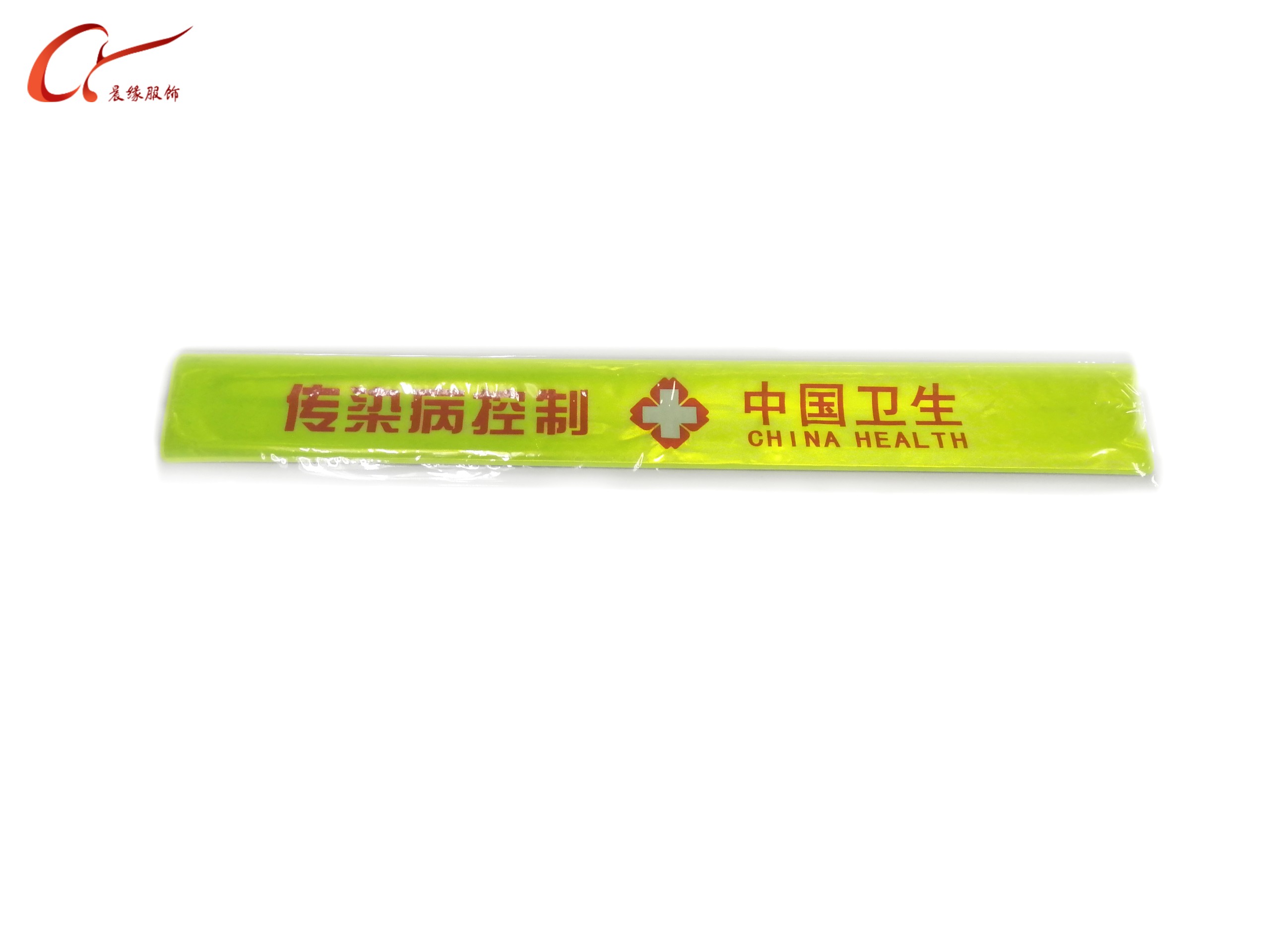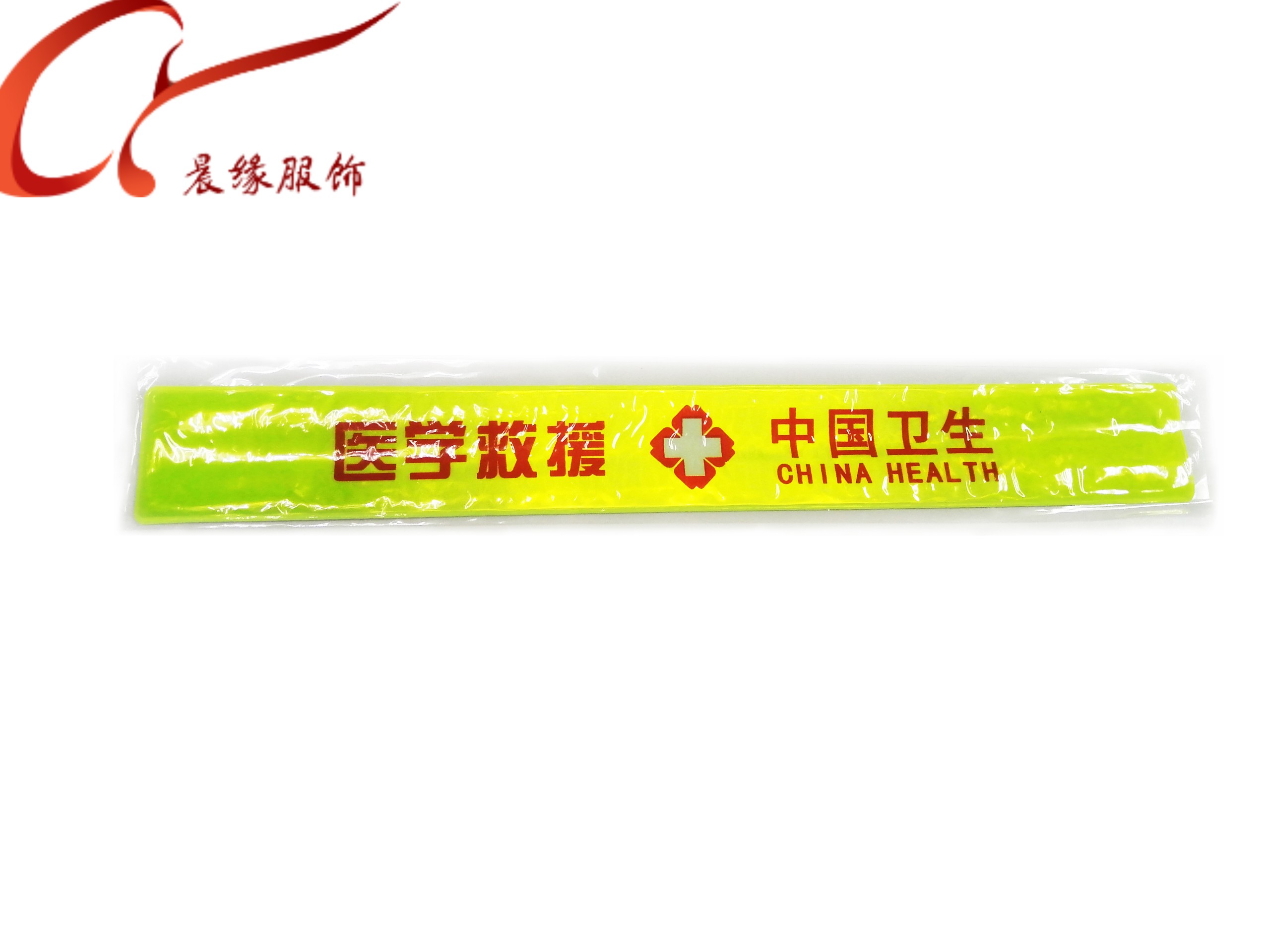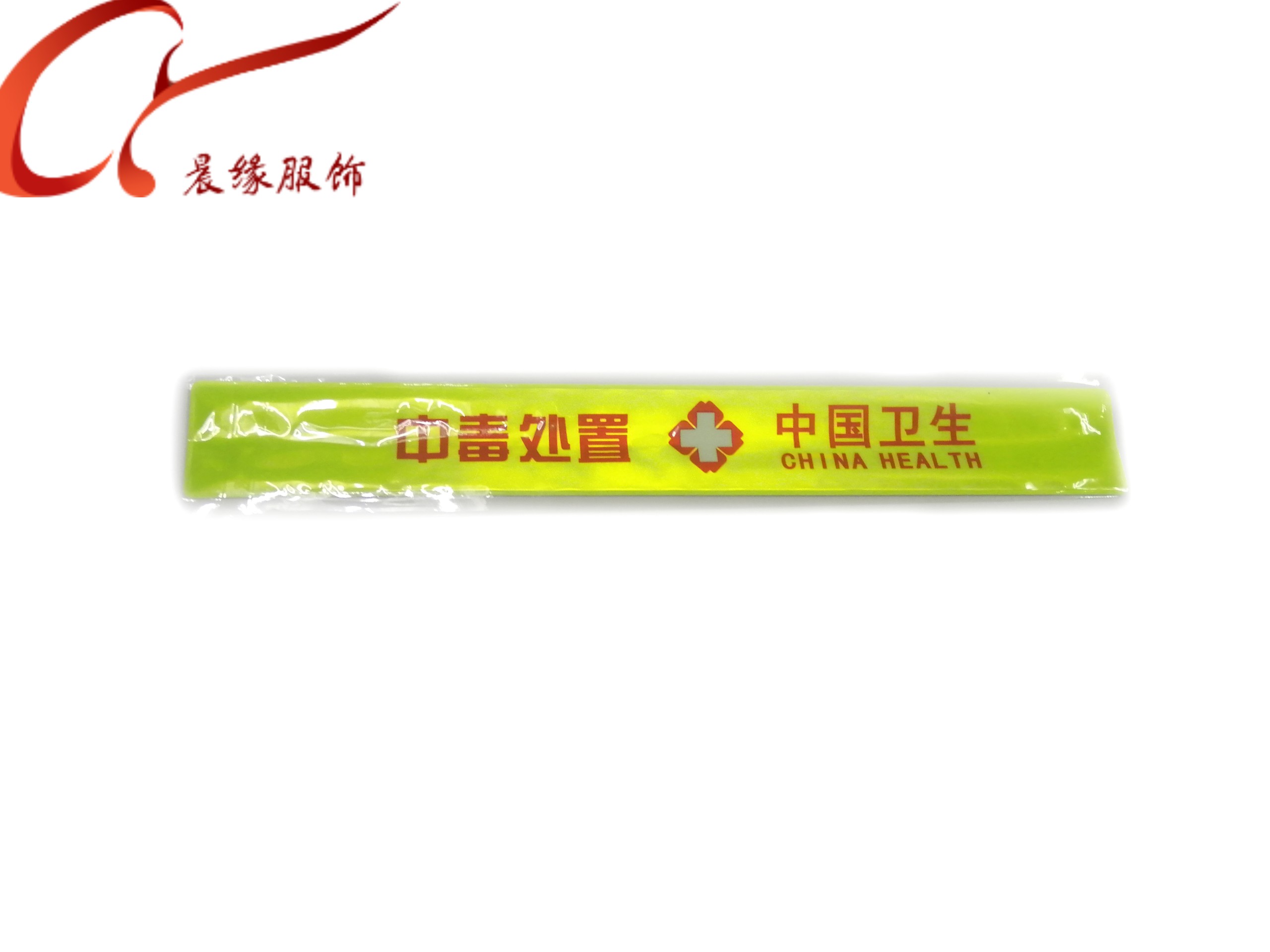 荧光标识条由队伍类别(如卫生应急/医学救援/中毒处置/传染病控制)文字内容和”卫生应急系统统一形象标识(横向标准组合)”图案构成。采用金属内芯,自卷腕式设计,可重复使用。